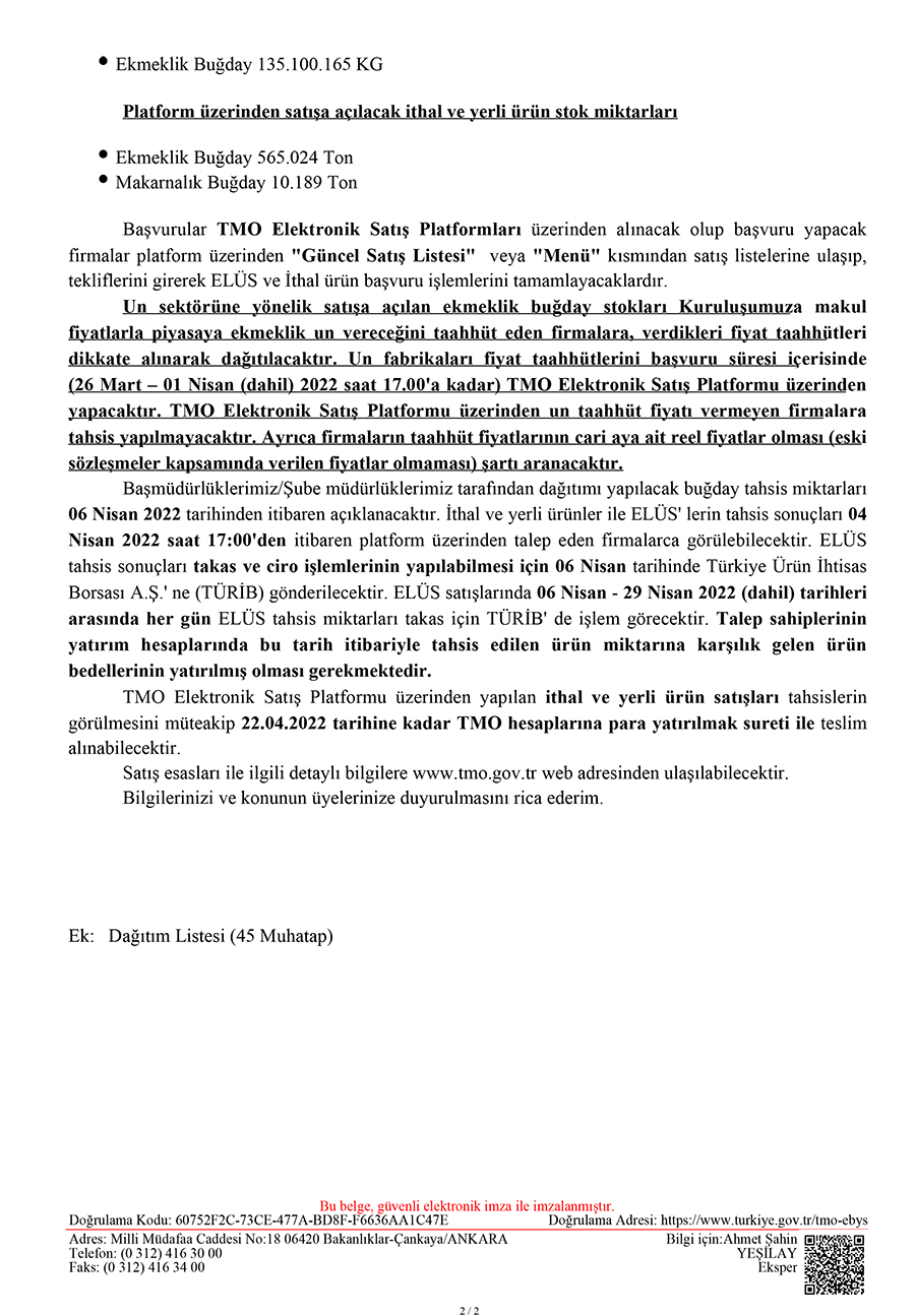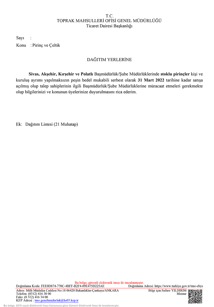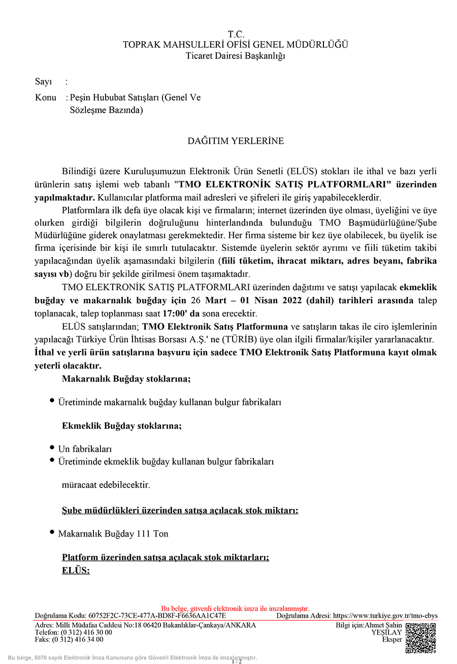 Peşin Hububat Satışları, Pirinç ve Çeltik Satışları Hakkında Duyuru
